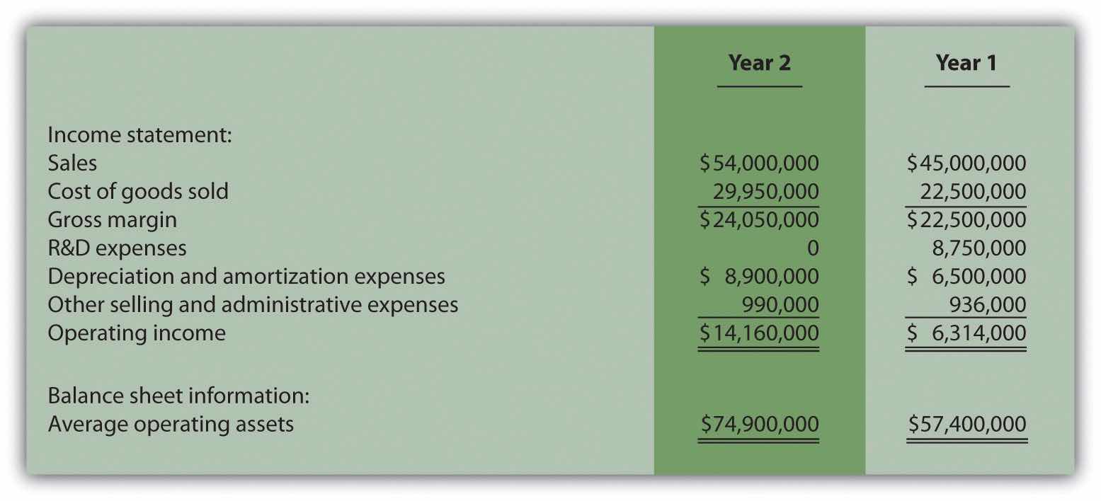 One year has passed with the new management group in place, and their financial results are presented as follows (for year two), along with last year’s information (year one). The entire $10,000,000 spent on R&D in year 2 was for unsuccessful projects since management decided to go a different direction with the company’s technology at the end of year 2. Nevertheless, top management capitalized the entire $10,000,000 and amortized these costs over 5 years as reflected in the year 2 financial results. (Note: of this amount, $2,000,000 is included in depreciation and amortization expense for year 2, and $8,000,000 is included in average operating assets for year 2.)