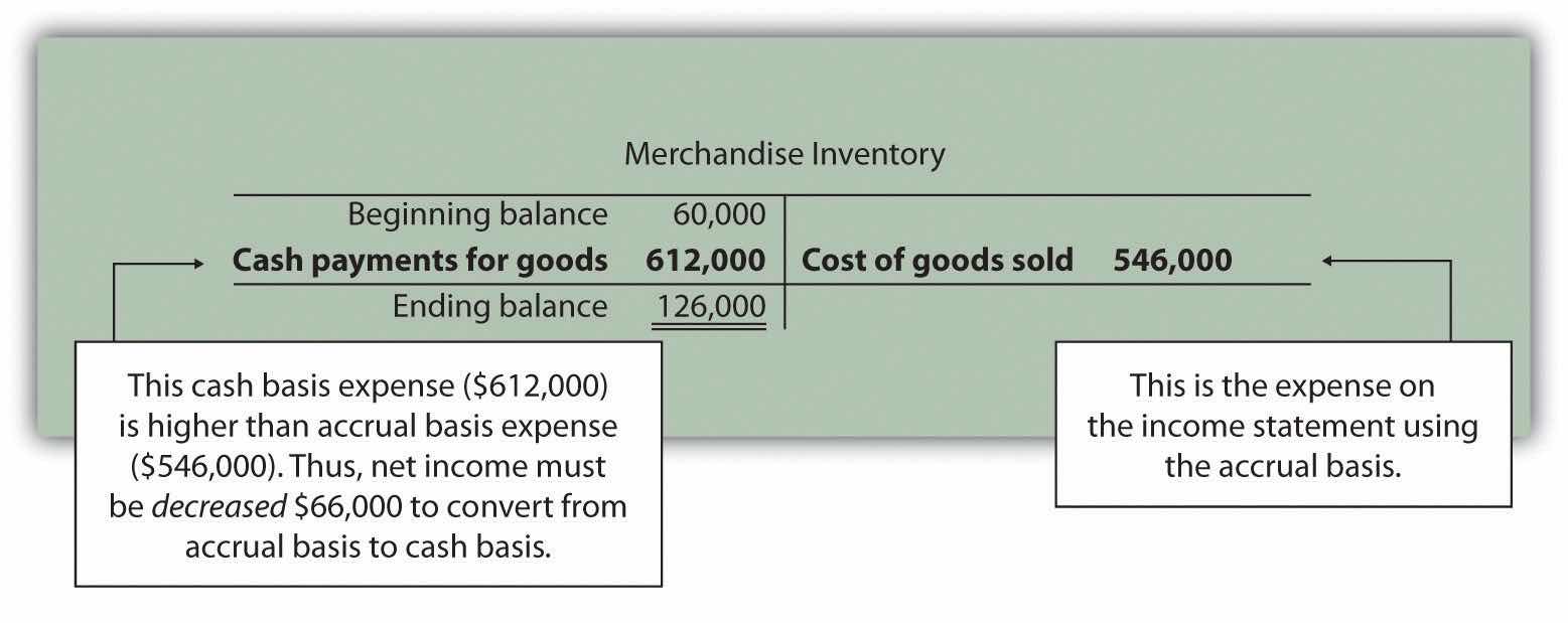 Merchandise inventory (current asset) increased by $66,000. Because the current asset rule states that increases in current assets are deducted from net income, $66,000 is deducted from net income in the operating activities section of the statement of cash flows. To explain why, let’s assume Home Store, Inc., pays cash for all purchases of merchandise inventory. If the merchandise inventory account increases over time, more goods are purchased than are sold. Because merchandise inventory at Home Store, Inc., increased $66,000 and cost of goods sold totaled $546,000 (as shown in Figure 12.3 "Balance Sheet and Income Statement for Home Store, Inc."), the company must have purchased inventory with a cost of $612,000 during the period (= $66,000 + $546,000). Thus more cash was paid for merchandise ($612,000) than was reflected on the income statement as cost of goods sold ($546,000). If expenses are higher using a cash basis, the adjustment must decrease net income. Therefore $66,000 is deducted from net income in the operating activities section of the statement of cash flows. This information is summarized in the merchandise inventory T-account in the following.
