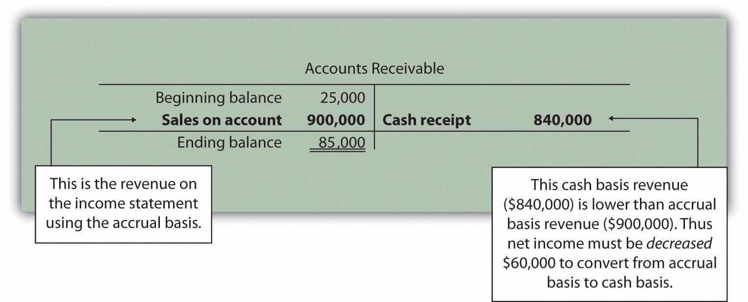 Assume all Home Store’s sales shown on the income statement are credit sales (each sale required a debit to accounts receivable and a credit to sales). The beginning accounts receivable balance of $25,000 is increased by $900,000 for credit sales made during the year, resulting in $925,000 in total receivables to be collected. Since $85,000 in accounts receivable remains at the end of the year, $840,000 in cash was collected (= $925,000 − $85,000). On a cash basis, Home Store, Inc., should show $840,000 in revenue rather than $900,000. Thus net income must be reduced by $60,000 (= $900,000 revenue using accrual basis − $840,000 revenue using cash basis). The accounts receivable T-account shown in the following provides further clarification.
