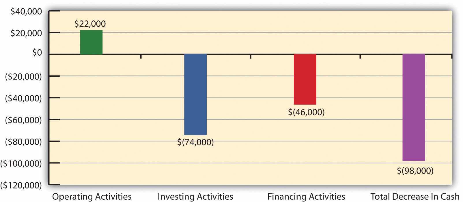 Figure 12.9 "Cash Flows at Home Store, Inc." provides a summary of cash flows for operating activities, investing activities, and financing activities for Home Store, Inc., along with the resulting total decrease in cash of $98,000.
