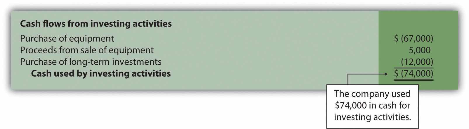 Figure 12.6 "Investing Activities Section of Statement of Cash Flows (Home Store, Inc.)" shows the three investing activities described previously: (1) a $67,000 decrease in cash from the purchase of equipment, (2) a $5,000 increase in cash from the sale of equipment, and (3) a $12,000 decrease in cash from the purchase of long-term investments. Examine Figure 12.6 "Investing Activities Section of Statement of Cash Flows (Home Store, Inc.)" carefully noting the impact these three items have on cash and the resulting cash used by investing activities of $74,000.