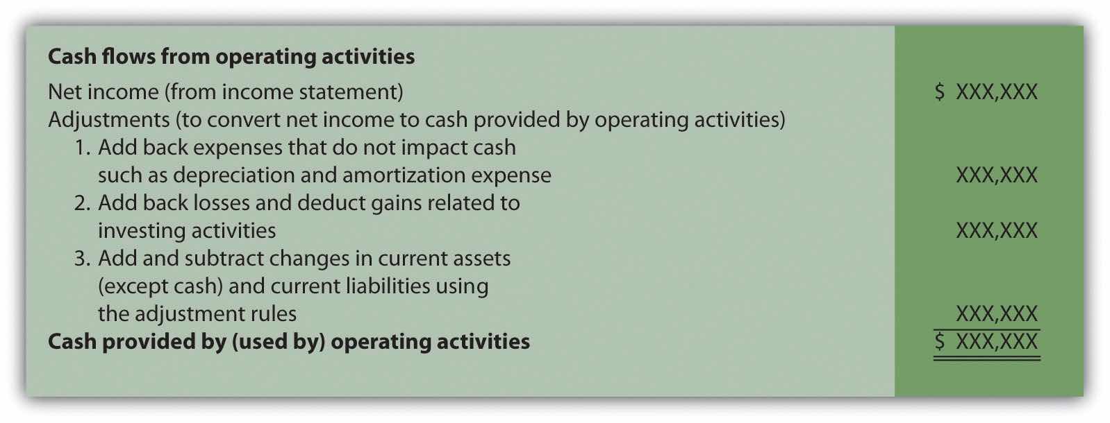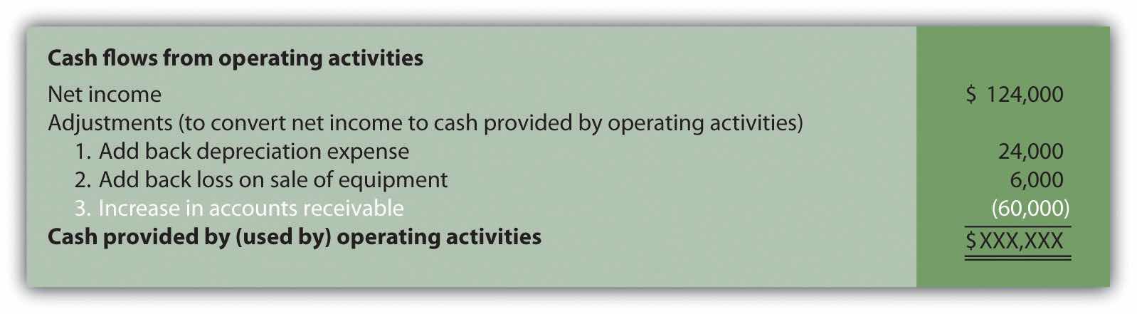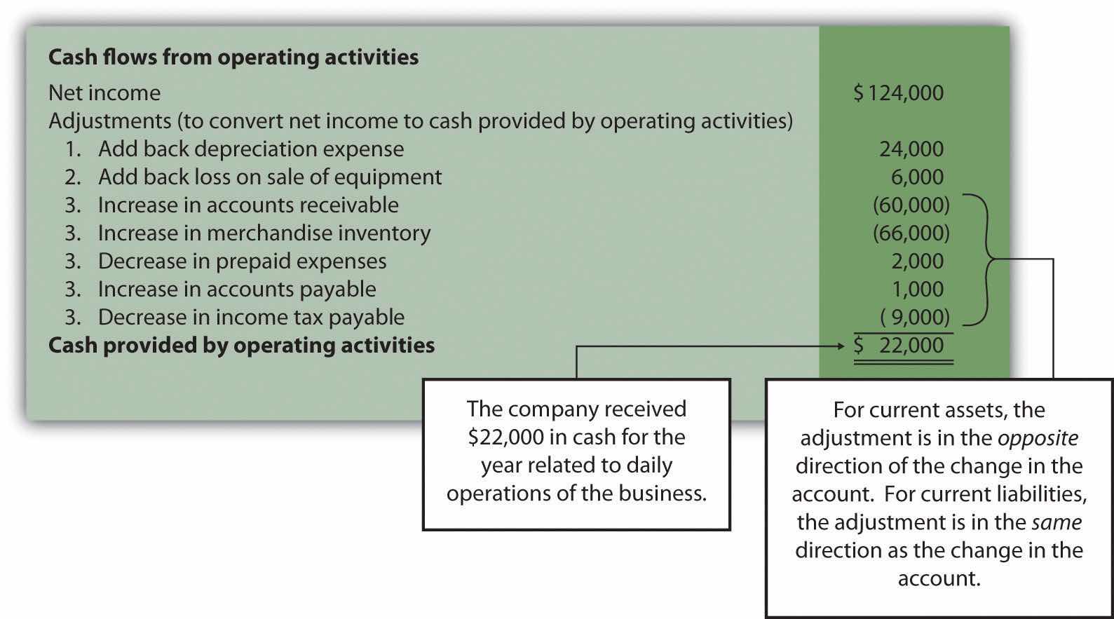 Three general types of adjustments are necessary to convert net income to cash provided by operating activities. These three types of adjustments are shown in Figure 12.4 "Operating Activities Format and Adjustments", which also displays the format used for the operating activities section of the statement of cash flows. Examine this figure carefully.