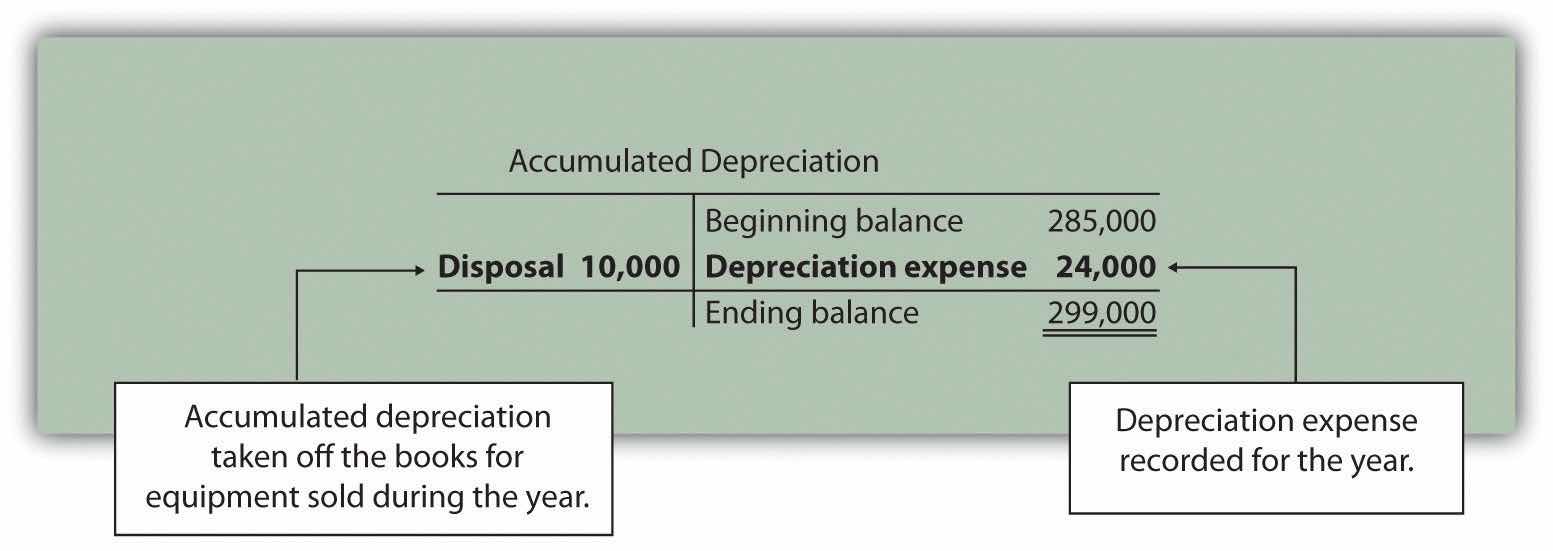 Two items caused the change in the accumulated depreciation account. First, the sale of equipment during the year caused the company to take $10,000 in accumulated depreciation off the books. Second, $24,000 in depreciation expense was recorded during the year (with a corresponding entry to accumulated depreciation). This information is summarized in the following T-account: