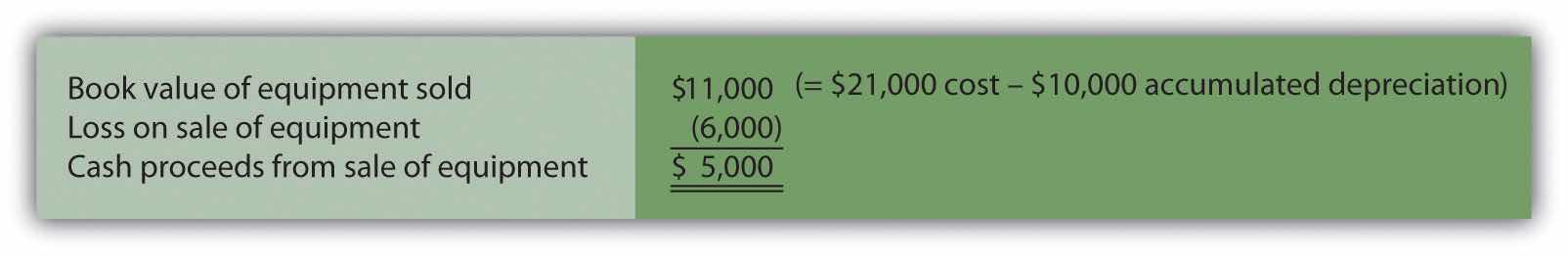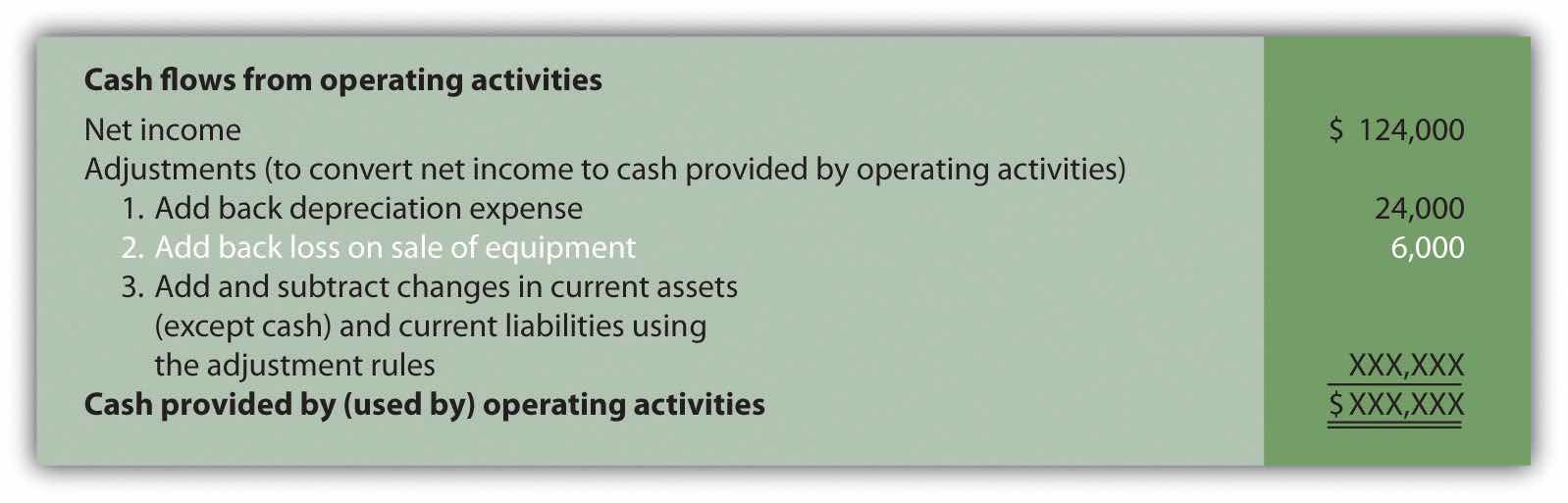 Since equipment is a noncurrent asset, cash activity related to the disposal of equipment should be included in the investment activities section of the statement of cash flows. Thus the $6,000 loss shown as a deduction on the income statement is added back to net income, and it will be included later in the investing activities section as part of the proceeds from the sale of equipment. In effect, we are reversing the $6,000 loss because it is not an operating expense.