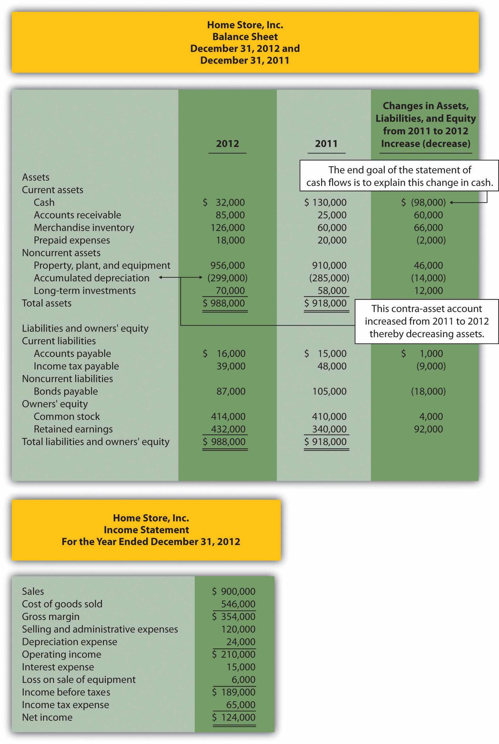 Answer: As stated earlier, the information needed to prepare the statement of cash flows includes the balance sheet, income statement, and other selected data. This information is presented in Figure 12.3 "Balance Sheet and Income Statement for Home Store, Inc.". Other pertinent data for 2012 are as follows: