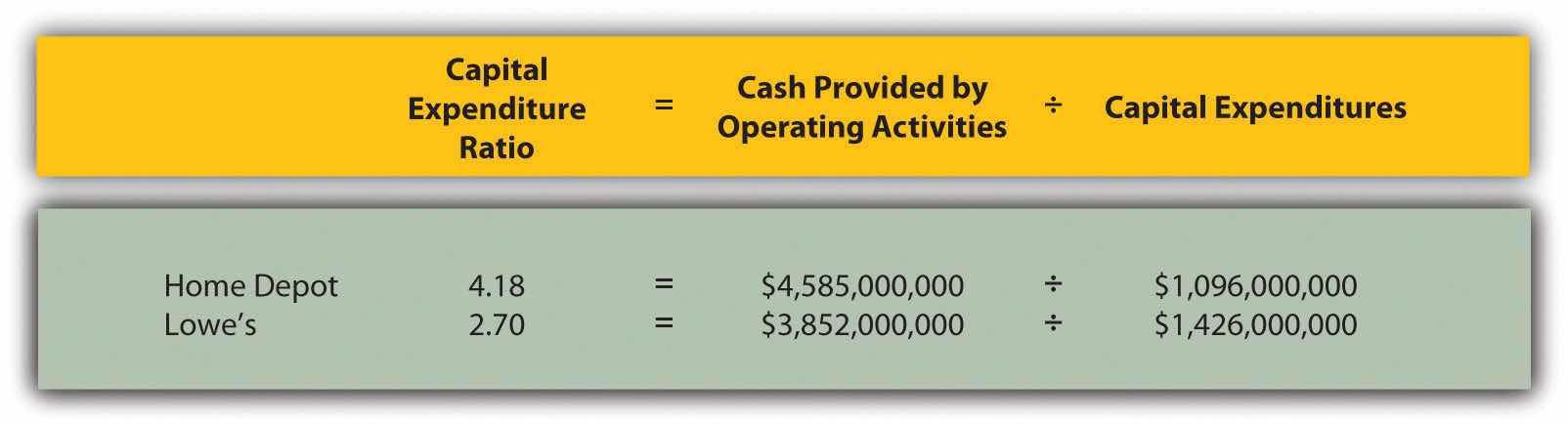 The capital expenditure ratio is calculated for Home Depot and Lowe’s in the following using information from each company’s statement of cash flows.