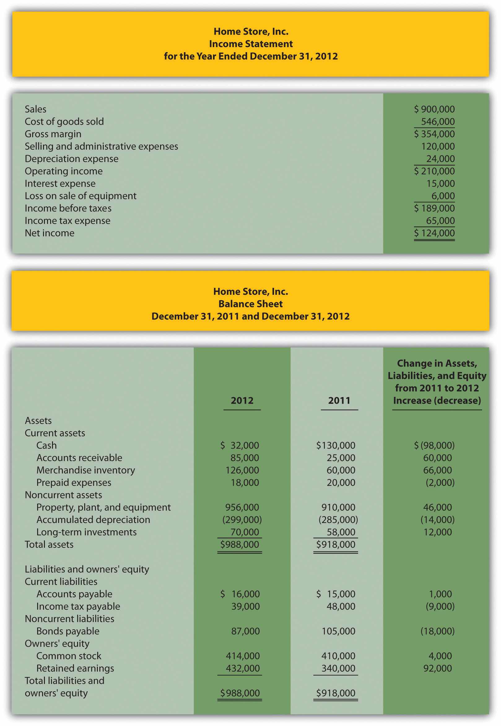 Adjustments must be made to each income statement item to convert income statement information from an accrual basis to a cash basis. These adjustments will be described next using the same information for Home Store, Inc., presented earlier in the chapter. The income statement and balance sheet for Home Store, Inc., are presented again in Figure 12.11 "Income Statement and Balance Sheet (Home Store, Inc.)". We will start at the top of the income statement with sales and work our way down item-by-item making adjustments to convert each item to a cash basis.