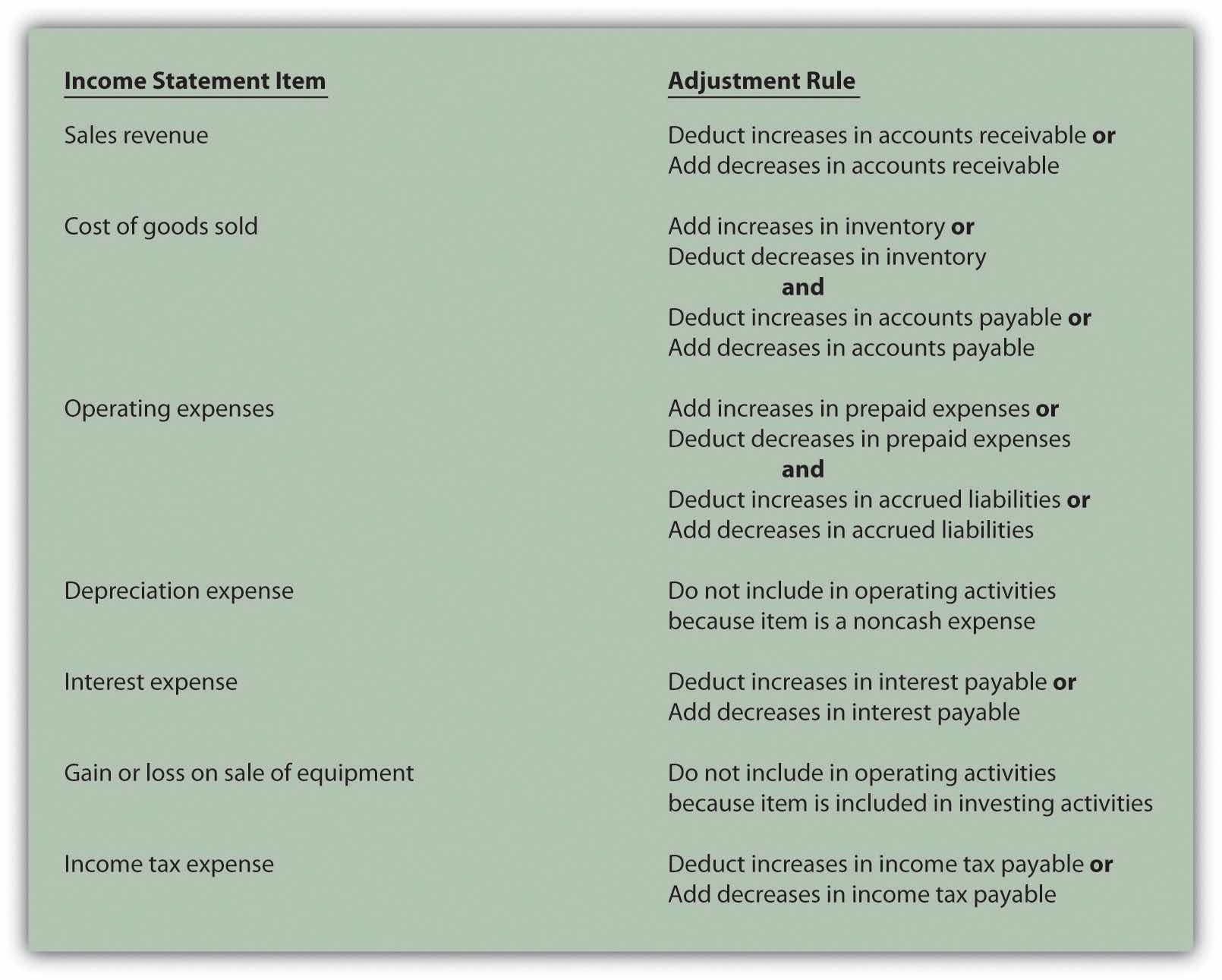 Figure 12.13 "Adjustment Rules for the Direct Method" summarizes the rules used to convert income statement line items to a cash basis. Review these rules carefully before working Note 12.40 "Review Problem 12.9".
