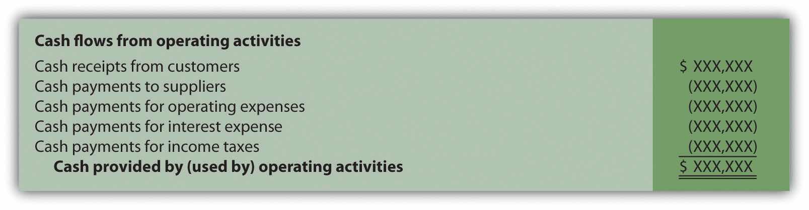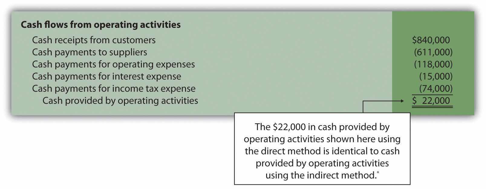 The first item shown in Figure 12.10 "Operating Activities Format Using the Direct Method", cash receipts from customers, is revenue (or sales) on a cash basis. The second item, cash payments to suppliers, is cost of goods sold on a cash basis. The third item, cash payments for operating expenses (also called selling and administrative expenses), is operating expenses on a cash basis. The fourth item, cash payments for interest expense, is interest expense on a cash basis. And the fifth item, cash payments for income taxes, is income tax expense on a cash basis. Cash receipts minus cash payments results in cash provided by operating activities.
