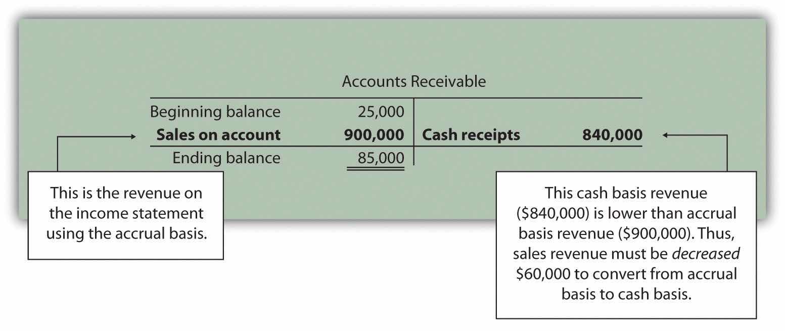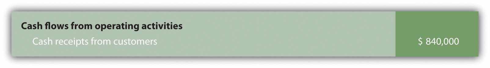 Answer: Sales of $900,000 shown on the income statement do not represent cash collected from sales. The adjustment rule used to convert sales to cash receipts from customers is as follows: increases in accounts receivable are deducted from sales revenue, and conversely, decreases in accounts receivable are added to sales revenue. Since accounts receivable for Home Store, Inc., increased $60,000, a deduction of $60,000 from sales revenue must be taken to find cash receipts from customers. Thus cash receipts from customers totaled $840,000 (= $900,000 sales − $60,000 increase in accounts receivable). The accounts receivable T-account shown in the following further clarifies this concept.