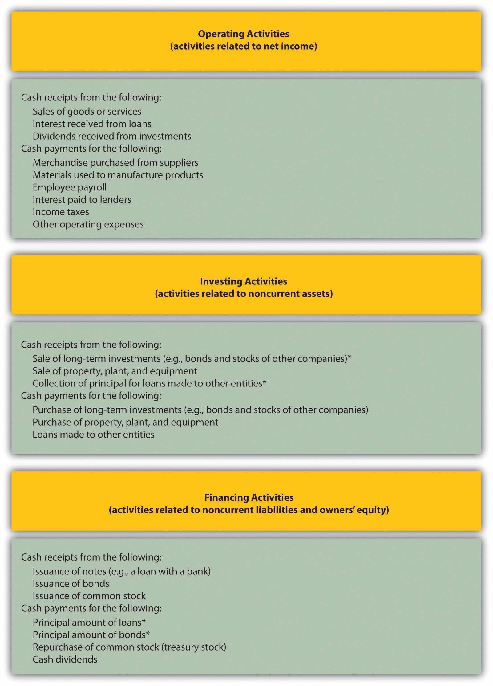 *Receipts of cash for dividends from investments and for interest on loans made to other entities are included in operating activities since both items relate to net income. Likewise, payments of cash for interest on loans with a bank or on bonds issued are also included in operating activities because these items also relate to net income.
