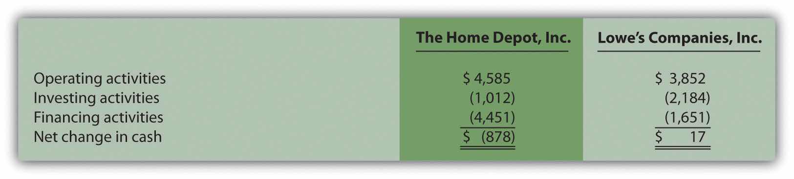 The Home Depot. Inc., and Lowe’s Companies, Inc., are large home improvement retail companies with stores throughout North America. A review of the statements of cash flows for both companies reveals the following cash activity. Positive amounts are cash inflows, and negative amounts are cash outflows.