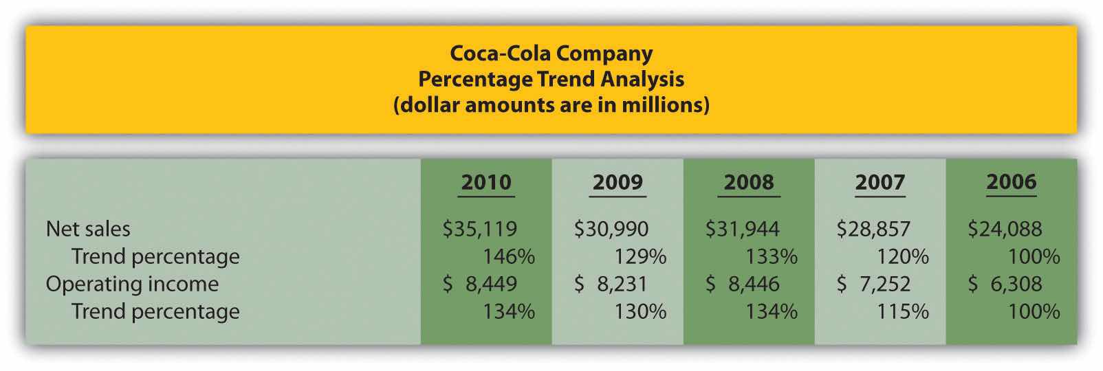 Figure 13.3 "Percentage Trend Analysis for " shows Coca-Cola’s trend percentages for net sales and operating income. Most analysts would expand this analysis to include most, if not all, of the income statement line items.