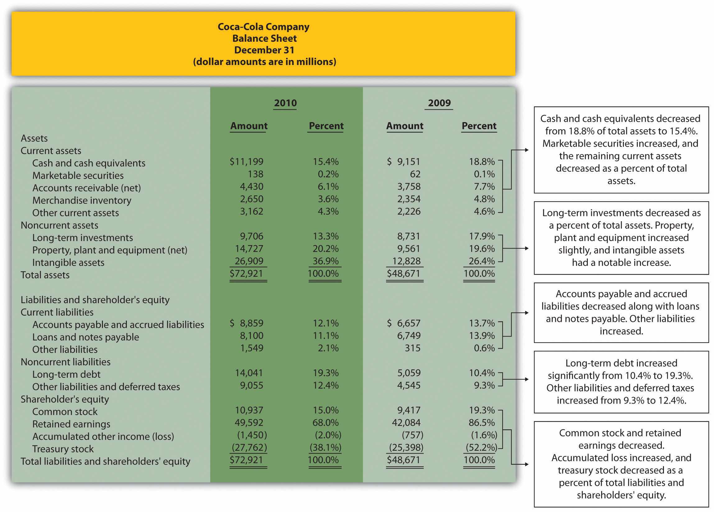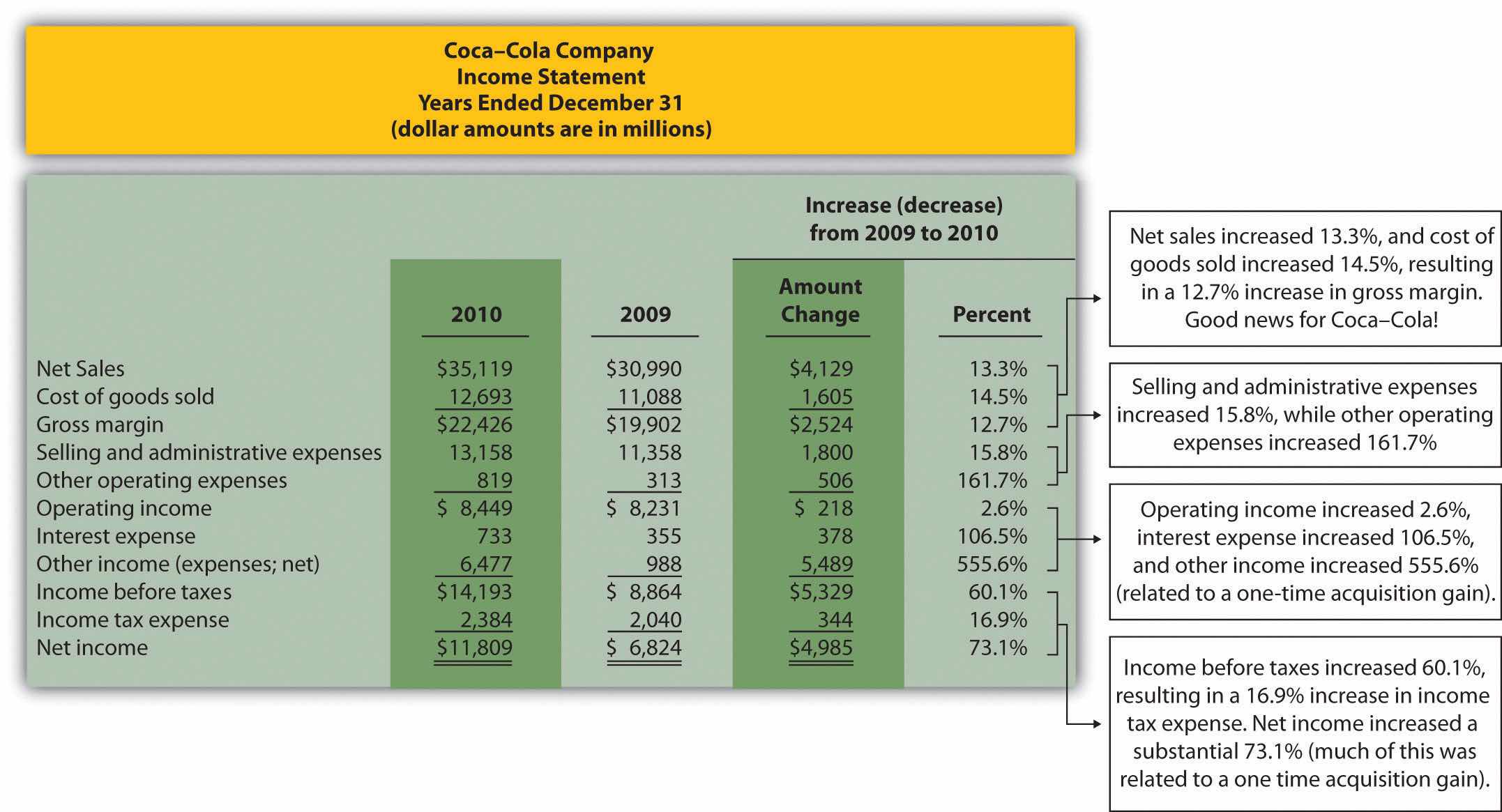 Figure 13.1 "Income Statement Trend Analysis for " shows that net sales increased by $4,129,000,000, or 13.3 percent. Cost of goods sold had a corresponding increase of $1,605,000,000, or 14.5 percent. The increase in net sales and related increase in cost of goods sold resulted in an increase in gross margin of $2,524,000,000, or 12.7 percent. The increase in selling and administrative expenses of $1,800,000,000, or 15.8 percent, outpaced the increase in net sales, resulting in a relatively small increase in operating income of $218,000,000, or 2.6 percent. The significant increase in other income (expenses), net of 555.6 percent relates to a one-time gain of $4,978,000,000 resulting from Coca-Cola’s acquisition of Coca-Cola Enterprises, Inc., in 2010 (this information comes from the notes to the financial statements). This one-time gain caused an unusually large increase in net income for 2010. This is important as we continue our analysis of Coca-Cola Company throughout the chapter. Net income will appear to have an unusually large increase as we cover various measures of performance, but keep in mind that the one-time gain in 2010 of $4,978,000,000 caused most of the increase from 2009 to 2010.