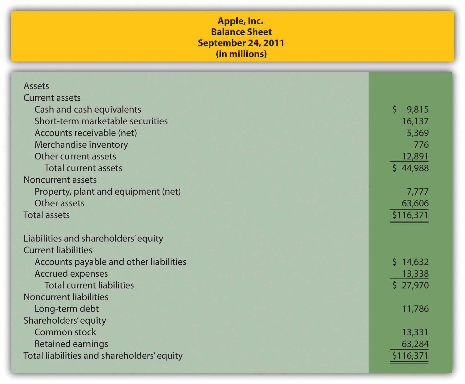 Current and Quick Ratios. A condensed balance sheet for Apple, Inc., appears in the following.