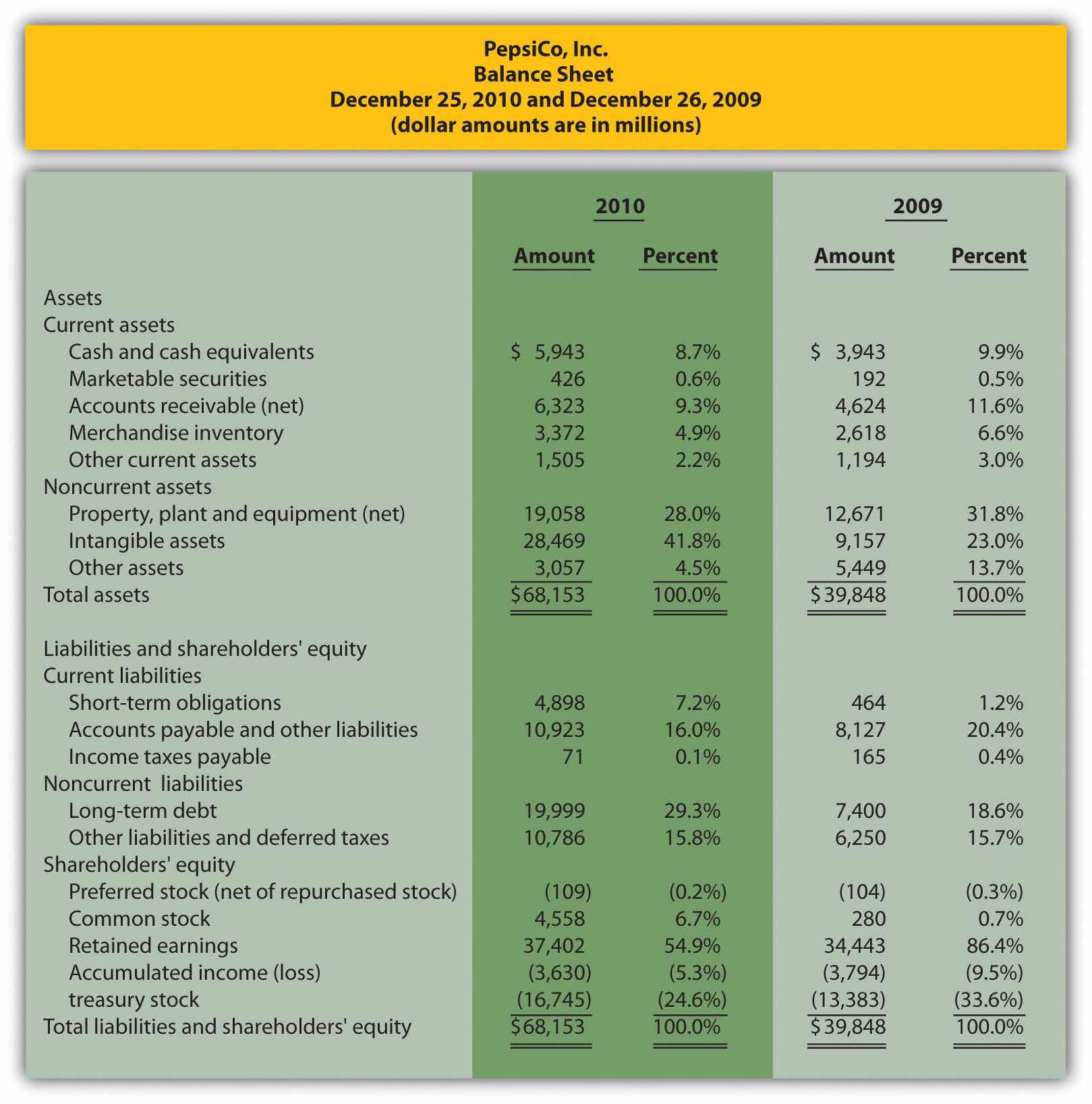 The composition of PepsiCo’s balance sheet had some significant changes from 2009 to 2010. The most notable changes occurred with intangible assets (23.0 percent in 2009 versus 41.8 percent in 2010), other assets (13.7 percent in 2009 versus 4.5 percent in 2010), short-term obligations (1.2 percent in 2009 versus 7.2 percent in 2010), long-term debt (18.6 percent in 2009 versus 29.3 percent in 2010), common stock (0.7 percent in 2009 versus 6.7 percent in 2010), and retained earnings (86.4 percent in 2009 versus 54.9 percent in 2010).