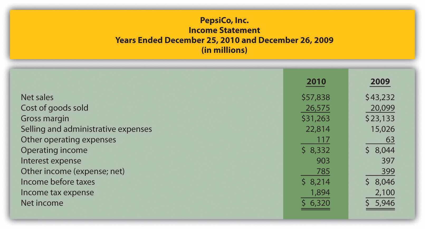 For example, in fiscal years 2010 and 2009, Coca-Cola had the operating income shown as follows. (Amounts are in millions. To convert to the actual amount, simply multiply the amount given times one million. For example, $8,449 × 1,000,000 = $8,449,000,000. Thus Coca-Cola had operating income of $8,449,000,000 in 2010.)