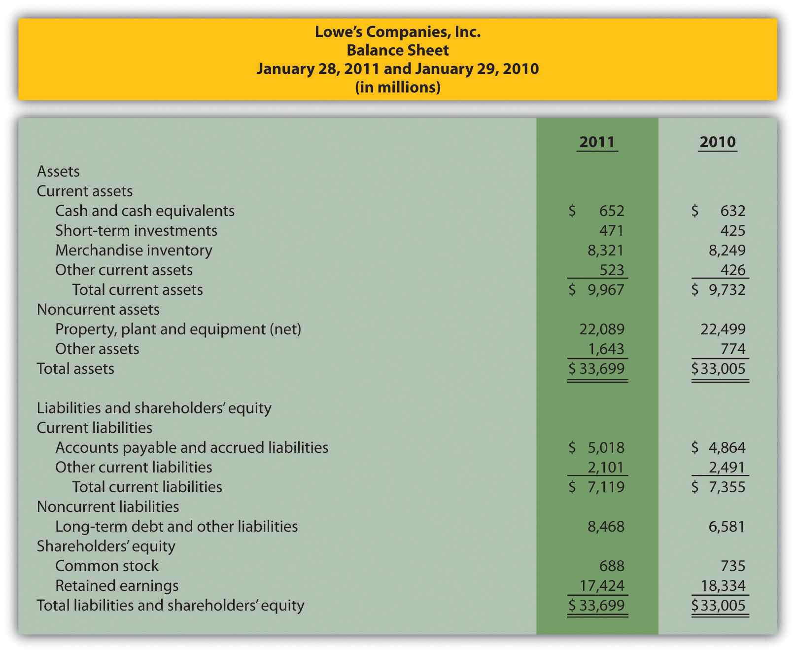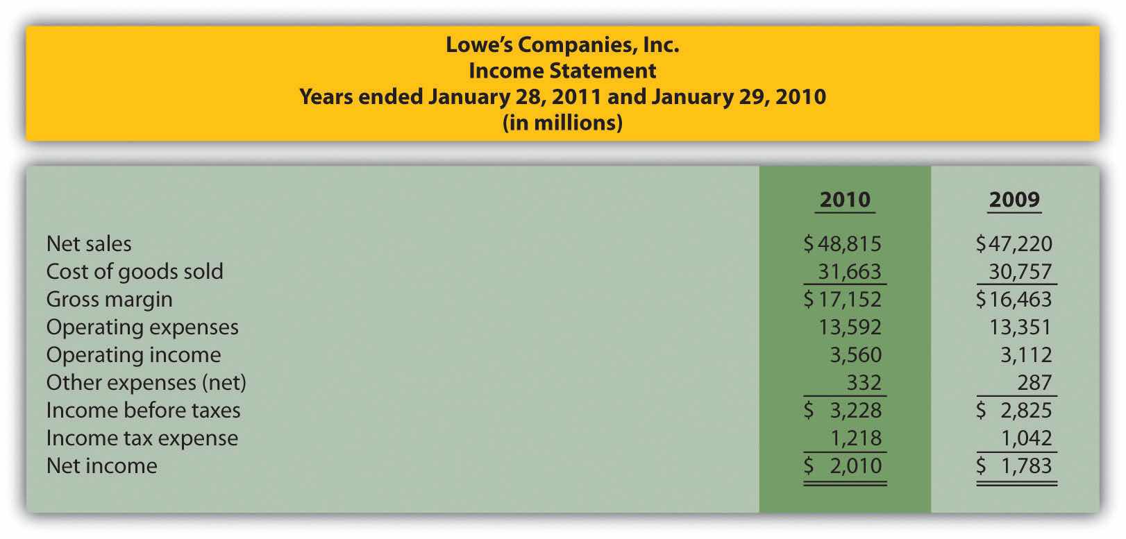 Group Activity: Analyzing Lowe’s Companies, Inc. The condensed income statement and balance sheet information provided as follows is for Lowe’s Companies, Inc., a large retail company that sells building materials and supplies. Lowe’s had 1,354,000,000 shares issued and outstanding at January 28, 2011, and the market price per share on that date was $24.83. (Note that Lowe’s 2010 fiscal year ends on January 28, 2011. This is called the 2010 fiscal year because only one month is in 2011, the other 11 months of the fiscal year are in 2010, and the company has chosen to refer to this as the 2010 fiscal year. This same concept applies to fiscal year 2009.)
