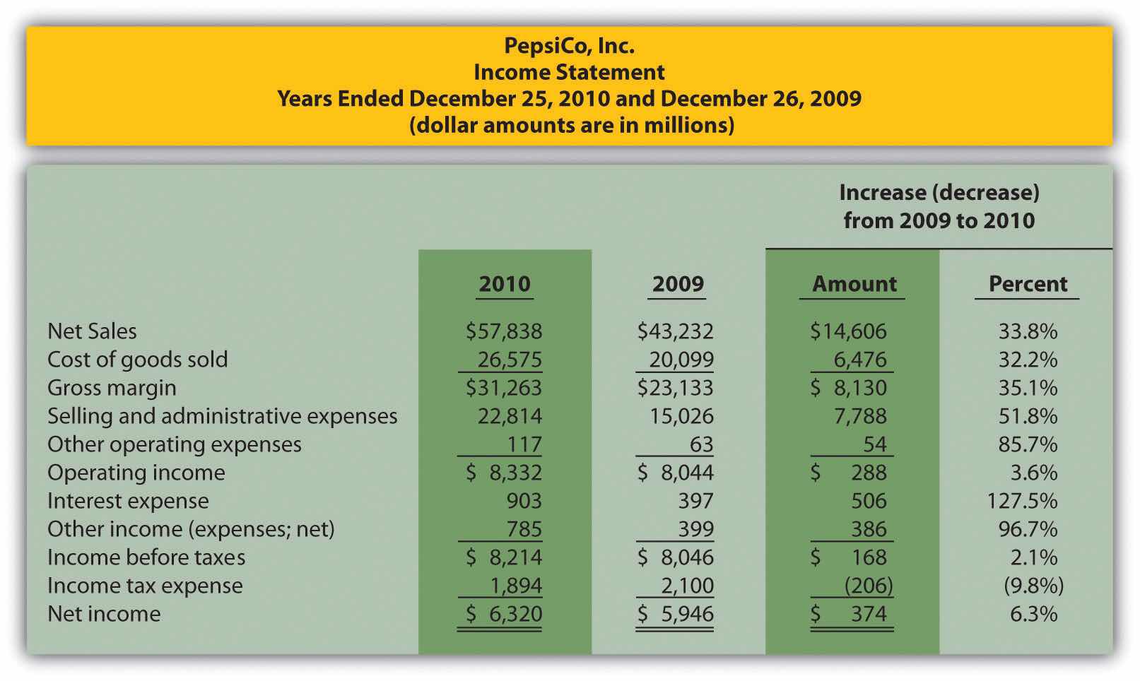 Although readers of the financial information can see that operating income increased from 2009 to 2010, the exact dollar amount of the change and the percent change is more helpful in evaluating the company’s performance. The dollar amount of change is calculated as follows: