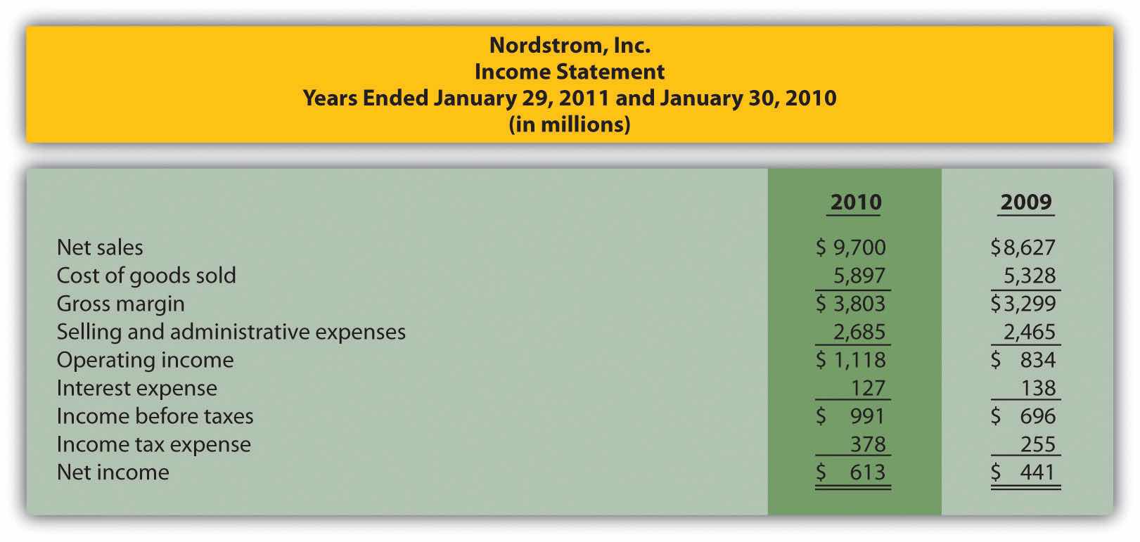 Trend Analysis and Common-Size Analysis. The following condensed income statement and balance sheet are for Nordstrom, Inc., a large retailer of apparel. (Note that Nordstrom’s 2010 fiscal year ends on January 29, 2011. This is called the 2010 fiscal year because only one month is in 2011, the other 11 months of the fiscal year are in 2010, and the company has chosen to refer to this as the 2010 fiscal year. This same concept applies to fiscal year 2009.)