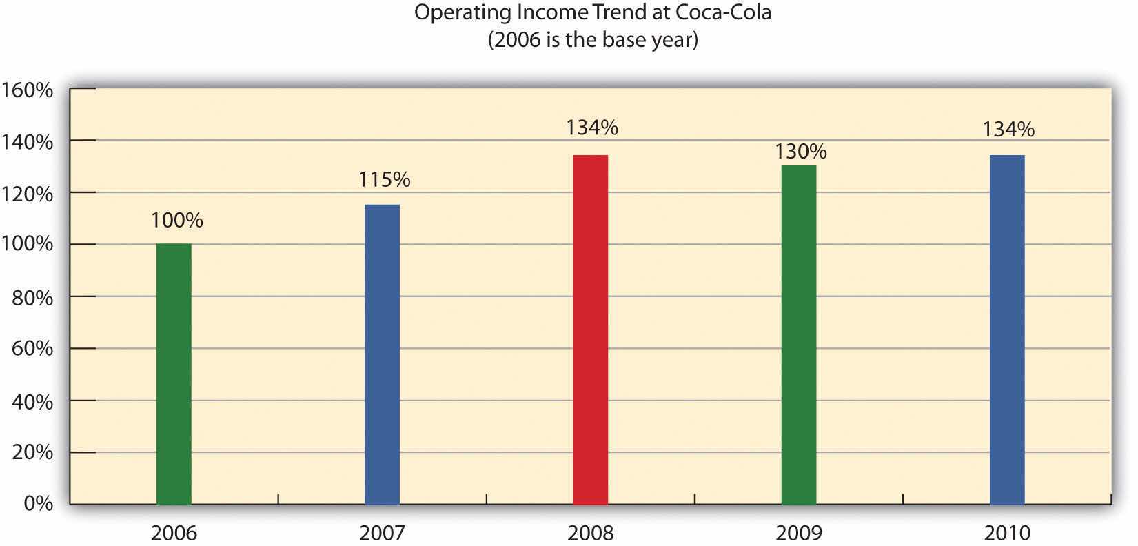 All percentages shown in Figure 13.3 "Percentage Trend Analysis for " are relative to the base year, which is fiscal year 2006. Notice that the increase in operating income of 34 percent (= 134 percent – 100 percent) from 2006 to 2010 was less than the increase in net sales of 46 percent for the same period. This signals that the increase in Coca-Cola’s operating expenses outpaced the increase in net sales during this period. Figure 13.4 "Five-Year Percentage Trend in Operating Income for " shows the trend percentages in Coca-Cola’s operating income from 2006 to 2010.